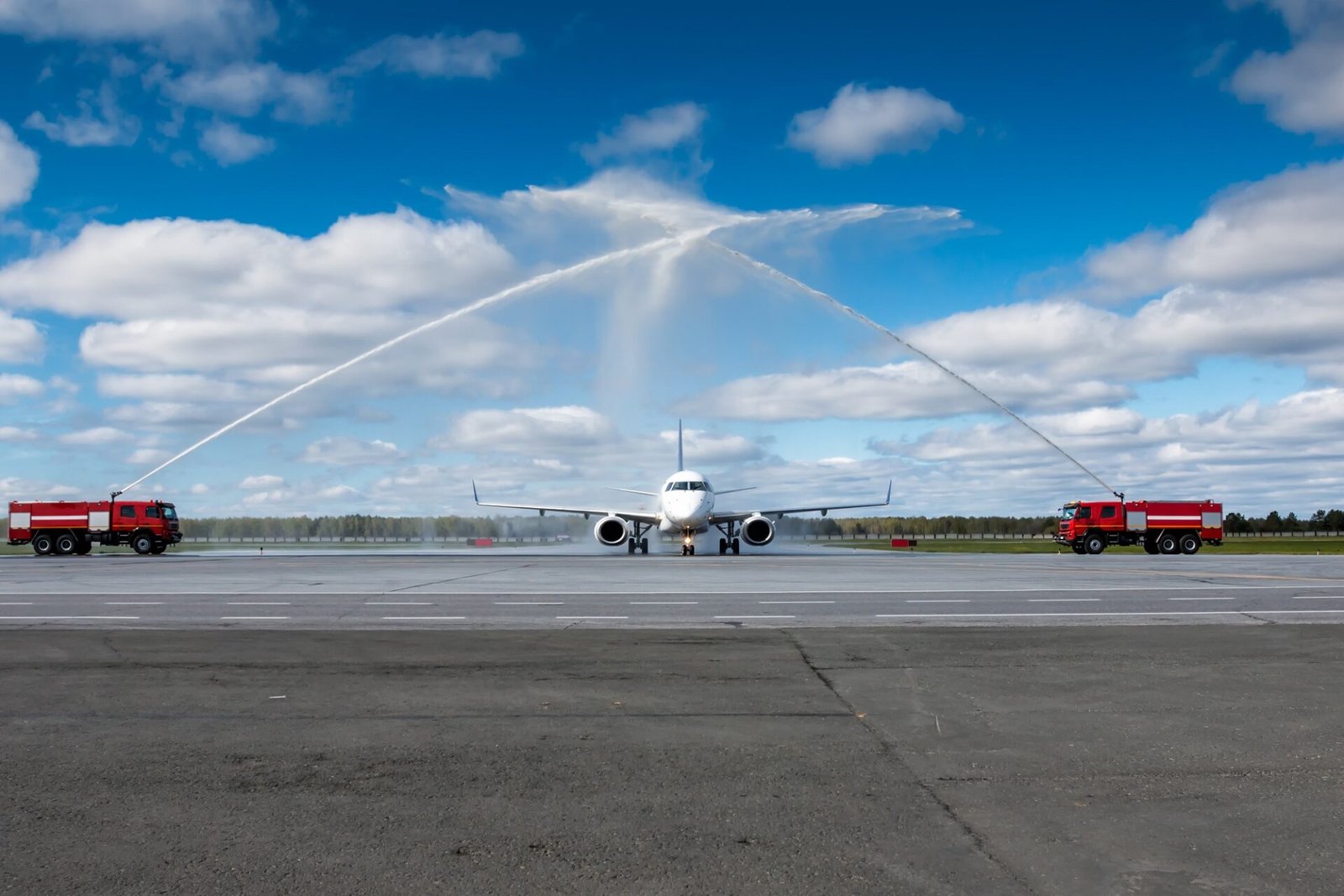 A water salute is a special aviation tradition where airport fire trucks spray powerful streams of water to form a grand arch, and an aircraft taxis through it. This beautiful gesture symbolizes celebration, honor, and respect in the aviation world.